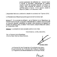 - Loi N° 2012-10 du 26 janvier 2012 portant autorisation de ratification de l’Accord visant à faciliter la circulation internationale du matériel visuel et auditif de caractère éducatif, scientifique et culturel, avec protocole de signature et modèle de certificat prévu à l’article IV de l’accord, adopté à Beyrouth (Liban), le 10 décembre 1948.