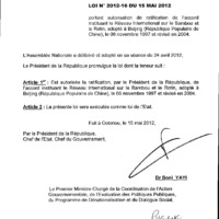- Loi N° 2012-16 du 15 mai 2012 portant autorisation de ratification de l’accord instituant le Réseau International sur le Bambou et le Rotin, adopté à Beijing (République populaire de Chine), le 06 novembre 1997 et révisé en 2004