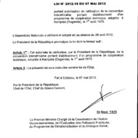 - Loi N° 2012-19 du 07 mai 2012 portant autorisation de ratification de la Convention interafricaine portant établissement d’un programme de coopération technique, adoptée à Kampala (Ouganda), le 1er août 1975.
