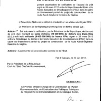 - Loi N° 2012-25 du 20 juin 2012 portant autorisation de ratification de l’accord de prêt signé le 26 mars 2012 entre la République du Bénin et la Fonds Saoudien de Développement (FSD) dans le cadre du financement partiel du projet de construction de la route Kandi-Ségbana-Frontière du Nigéria