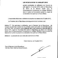 - Loi N° 2012-30 du 10 juillet 2012 portant autorisation de ratification de l’Accord de prêt signé le 18 janvier 2012 entre la République du Bénin et la Banque Arabe pour le Développement Economique en Afrique (BADEA) dans le cadre du financement partiel du projet de construction d’un pont sur le fleuve Mono