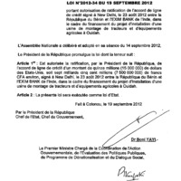 - Loi N° 2012-34 du 19 septembre 2012 portant autorisation de ratification de l'accord de ligne de crédit signé à New Delhi le 23 août 2012 entre la République du Bénin et l'EXIM BANK de l'Inde dans le cadre du financement du projet d'installation d'une usine de montage de tracteurs et d'équipements agricoles à Ouidah.