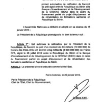 - Loi N° 2013-03 du 25 janvier 2013 portant autorisation de ratification de l'accord de prêt signé entre la République du Bénin et la Banque d'Investissement et de Développement de la CEDEAO (BIDC) dans le cadre du financement partiel du projet d'équipement et de réhabilitation des formations sanitaires en République du Bénin.