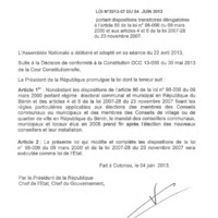 - Loi N° 2013-07 du 04 juin 2013 portant dispositions transitoires dérogatoires à l'article 86 de la loi n° 98-006 du 09 mars 2000 et aux articles 4 et 6 de la loi n° 2007-28 du 23 novembre 2007