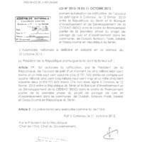 - Loi N° 2013-18 du 11 octobre 2013 portant autorisation de ratification de l’accord de prêt signé à Cotonou le 12 Février 2013 entre la République du Bénin et la Banque d’Investissement et de Développement de la CEDEAO (BIDC) dans le cadre du financement partiel de la première phase du projet de pavage de rues et d’assainissement dans les communes de Ouidah, Bohicon, Pobè, Sakété et Dassa-zoumé en République du Bénin.