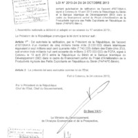 - Loi N° 2013-24 du 24 Octobre 2013 portant autorisation de ratification de l’accord d’ISTISNA’A signé à Cotonou le 10 avril 2013 entre la République du Bénin et la Banque Islamique de Développement (BID) dans le cadre du financement partiel du Projet d’Amélioration de la Productivité Agricole des Petits Exploitants en République du Bénin (PAPAPE-Bénin).