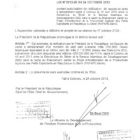 - Loi N° 2013-26 du 24 Octobre 2013 portant autorisation de ratification de l’accord de vente à tempérament signé à Cotonou le 10 avril 2013 entre la République du Bénin et la Banque Islamique de Développement (BID) dans le cadre du financement partiel du Projet d’Amélioration de la Productivité Agricole des Petits Exploitants en République du Bénin (PAPAPE-Bénin).