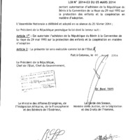 - Loi N° 2014-03 du 05 mars 2014 portant autorisation d’adhésion de la République du Bénin, à la convention de la Haye du 29 mai 1993 sur la protection des enfants et la coopération en matière d’adoption.