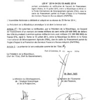 - Loi N° 2014-04 du 05 mars 2014 portant autorisation de ratification de l’accord de financement signé à Rome, le 15 juillet 2013, entre la République du Bénin et le Fonds International de Développement Agricole (FIDA), dans le cadre du financement partiel du Projet d’appui à la promotion de Services Financiers Ruraux Adaptés (PAPSFRA).