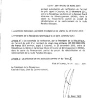 - Loi N° 2014-06 du 05 mars 2014 portant autorisation de ratification de l’accord de prêt signé à Cotonou, le 23 décembre 2013, entre la République du Bénin et la Banque Ouest Africaine de Développement (BOAD), dans le cadre du financement partiel du projet de réhabilitation et de renforcement de la route Parakou-Djougou.