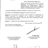 - Loi N° 2014-09 du 07 mars 2014 portant autorisation de ratification de l’accord concernant la Promotion et la protection réciproque des investissements, signé à Ottawa, le 08 janvier 2013, entre la République du Bénin et le Gouvernement du Canada.