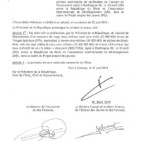 - Loi N° 2014-17 du 13 juin 2014 portant autorisation de ratification de l’accord de financement signé à Washington DC, le 10 avril 2014 entre la République du Bénin et l’Association Internationale de Développement (AID), dans le cadre du Projet emploi des jeunes (PEJ).