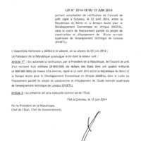 - Loi N° 2014-18 du 13 juin 2014 portant autorisation de ratification de l’accord de prêt signé à Cotonou, le 22 avril 2014, entre la République du Bénin et la Banque Arabe pour le Développement Economique en Afrique (BADEA), dans le cadre du financement partiel du projet de construction et d’équipement de l’Ecole normale supérieure de l’enseignement technique de Lokossa (ENSETL).