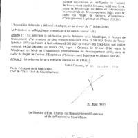 - Loi N° 2014-21 du 04 juillet 2014 portant autorisation de ratification de l'accord de financement signé à Cotonou le 20 mai 2014 entre la République du Bénin et l'Association Internationale de Développement (AID) dans le cadre du Projet de Centres d'Excellence d'Enseignement Supérieur en Afrique.(CEESA)