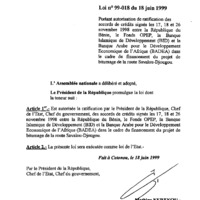 - Loi n° 99-018 du 18 juin 1999 portant autorisation de ratification des accords de crédits signés les 17, 18 et 26 novembre 1998 entre la République du Bénin, le Fonds OPEP, la Banque Islamique de Développement (BID) et la Banque Arabe pour le Développement Economique de l'Afrique (BADEA) dans le cadre du financement du projet de bitumage de la route Savalou-Djougou