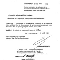 - Loi n° 99-019 du 05 août 1999 portant autorisation de ratification de la Convention internationale contre l'apartheid dans les sports signée le 16 mai 1986