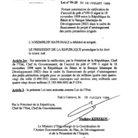 - Loi n° 99-020 du 29 juillet 1999 portant autorisation de ratification de l'accord de prêt n° 199 G signé le 18 novembre 1998 entre la République du Bénin et la Banque Islamique de Développement (BID) dans le cadre du financement du projet d'aménagement des petits périmètres irrigués