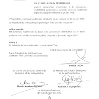 - Loi N°2020-01 du 04 février 2020 portant autorisation d’adhésion à la Convention d’UNIDROIT sur les biens culturels volés ou illicitement exportés, adoptée à Rome, le 24 juin 1995.