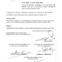 - Loi N°2020-11 du 27 avril 2020 portant autorisation d'adhésion à la Convention des Nations Unies sur la circulation routière, adoptée à Vienne, le 08 novembre 1968.