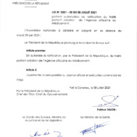 Loi N°2021-05 du 08 Juillet 2021 portant autorisation de ratification du traité portant création de l’Agence africaine du Médicament