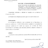 - Loi N°2021-07 du 04 Octobre 2021 portant autorisation de ratification du Protocole Additionnel n° 1/2017/CCEG/UEMOA modifiant et complétant le protocole Additionnel n° 1 relatif aux organes de contrôle de l’UEMOA, adopté à Abidjan en Côte d’Ivoire, le 10 avril 2017