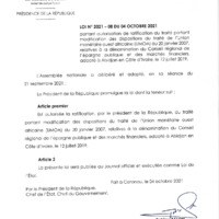 - Loi N°2021-08 du 04 Octobre 2021 portant autorisation de ratification, du Traité portant modification des dispositions du Traité de l’Union Monétaire Ouest Africaine (UMOA) du 20 janvier 2007, relatives à la dénomination du Conseil régional de l’épargne publique et des marchés financiers, adopté à Abidjan en Côte d’Ivoire, le 12 juillet 2019