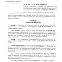 - Loi N°2021-11 du 20 Décembre 2021 portant mesures spéciales de répression des infractions commises à raison du sexe et de protection de la femme en République du Bénin