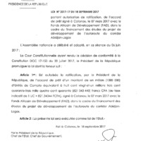 - Loi n° 2017-17 du 18 septembre 2017 portant autorisation de ratification, de l'accord de prêt signé à Cotonou, le 07 mars 2017 avec le Fonds Africain de Développement (FAD), dans le cadre du financement des études du projet de l'autoroute du corridor Abidjan-Lagos.