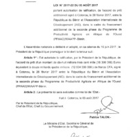 - Loi n° 2017-22 du 3 août 2017 portant autorisation de ratification de l'accord de prêt additionnel, signé à Cotonou, le 28 février 2017, entre la République du Bénin et l'Association Internationale de Développement (AID), dans le cadre du financement additionnel de la seconde phase du Programme de Productivité Agricole en Afrique de l'Ouest (PPAAO)/WAAPP-Bénin.