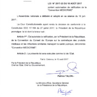 Loi n° 2017-23 du 10 août 2017 portant autorisation de ratification de la "Convention MEDICRIME".