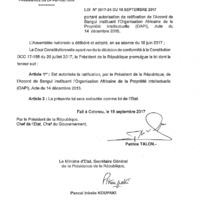- Loi n° 2017-24 du 18 septembre 2017 portant autorisation de ratification de l'Accord de Bangui instituant l'Organisation Africaine de la Propriété intellectuelle (OAPI), Acte du 14 décembre 2015.