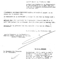 - Loi N°85-001 du 11 février 1985 portant approbation de la décision -loi N°84-001/ANR/CP du 13 août 1984 portant loi de finances rectificative pour la gestion 1983