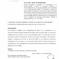 - Loi N°2024-06 du 1er février 2024 portant autorisation d’adhésion à la convention sur la cybercriminalité adoptée à Budapest (Hongrie), le 13 novembre 2001, du protocole additionnel à la convention sur la cybercriminalité, relatif au renforcement de la coopération et de la divulgation de preuves électroniques adoptés à Strasbourg (France), le 12 mai 2002