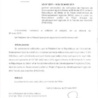 - Loi n° 2019-14 du 22 mars 2019 portant autorisation de ratification, de l'accord de financement signé à Rome, le 08 février 2019, entre la République du Bénin et le Fonds International de Développement Agricole (FIDA), dans le cadre du financement partiel du Projet d'Appui au Développement Agricole et à l'accès aux Marchés (PADAAM)