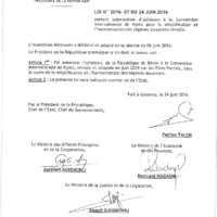 - Loi n° 2016-07 du 24 juin 2016 portant autorisation d’adhésion à la Convention Internationale de Kyoto pour la simplification et l’harmonisation des régimes douaniers révisée