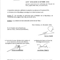 Loi n° 2016-26 du 24 octobre 2016 portant autorisation de ratification de l'accord de Paris, signé à New York, le 22 avril 2016