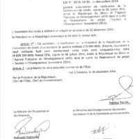 - Loi n° 2016-34 du 26 Décembre 2016 portant autorisation de ratification de la Convention de crédit signée le 08 juillet 2016, entre la République du Bénin et l'Agence Française de Développement (AFD) dans le cadre du financement du projet "Soutien à l'Enseignement Secondaire (SEnS)".