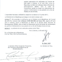 - Loi n° 2015-23 du 3 août 2015 portant autorisation de ratification, de l'accord de prêt signé à Cotonou le 07 avril 2015 entre la République du Bénin et la Banque Ouest Africaine de Développement (BOAD) dans le cadre du financement partiel du projet de renforcement du système d'alimentation en eau potable de la ville de Parakou et ses environs.