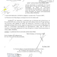 - Loi n° 2015-27 du 14 octobre 2015 portant autorisation de ratification de l'accord signé le 24 juin 2015 à Cotonou entre la République du Bénin et l'Association Internationale de Développement (AID) dans le cadre du deuxième financement additionnel du Projet d'Urgence de Gestion Environnemental en Milieu Urbain (PUGEMU).