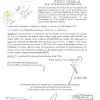 - Loi n° 2015-28 du 22 octobre 2015 portant autorisation de ratification, de l'accord de prêt signé par échange de courriers le 07 avril 2015 entre la République du Bénin et EXIMBANK de Chine dans le cadre du financement du Projet de Développement des Infrastructures des Télécommunications et des Technologies de l'Information et de la Communication Large Bande Nationale (PDI2T).