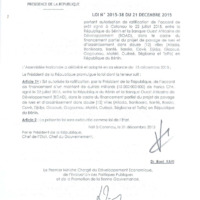 - Loi n° 2015-38 du 21 décembre 2015 portant autorisation de ratification, de l'accord de prêt signé à Cotonou le 22 juillet 2015 entre la République du Bénin et la Banque Ouest Africaine de Développement (BOAD) dans le cadre du financement partiel du projet de pavage de rues et d'assainissement de douze (12) villes (Allada, Banikoara, Bantè, Bassila, Covè, Djidja, Glazoué, Gogounou, Matéri, Ouèssè, Ségbana et Toffo) en République du Bénin
