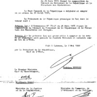 - Loi n° 90-001 du 2 mai 1990 portant abrogation de l’ordonnance n° 75-21 du 24 mars 1975 fixant la composition du cabinet du Président de la République et de la structure des ministères