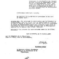 - Loi n° 92-015 du 13 juillet 1992 autorisant la ratification de l’Accord de Prêt relatif au financement du 2ème Projet de Développement Rural dans l’Atacora signé le 23 Janvier 1992 à Rome entre la République du Bénin et le Fonds International pour le Développement Agricole (FIDA).