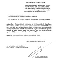 - Loi n° 99-006 du 19 janvier 1999 portant autorisation de ratification de l'accord de crédit n° 3073-BEN signé le 22 juin 1998 entre la République du Bénin et l'Association internationale de développement dans le cadre du financement du projet« Fonds Social »