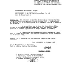 - Loi n° 94-005 du 10 juin 1994 portant autorisation de perception des impôts et taxes d’exécution des dépenses de l’État par douzièmes provisoires pour le mois de Juin 1994.