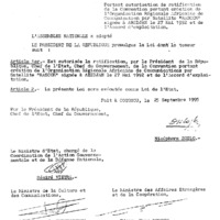 - Loi n° 95-011 du 25 septembre 1995 portant autorisation de ratification de la Convention portant création de l’Organisation Régionale Africaine de Communication par satellite « RASCOM » signée à Abidjan le 27 mai 1992 et l’accord d’exploitation.
