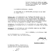 - Loi n° 96-001 du 5 février 1996 portant fixation du délai au terme duquel le Président de la République ne peut plus prendre des mesures exceptionnelles.