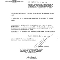 - Loi n° 96-009 du 31 mai 1996 portant autorisation d’adhésion à la Convention des Nations Unies contre le trafic illicite de stupéfiants et de substances psychotropes de 1988.