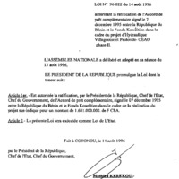 - Loi N° 96-022 du 14 août 1996 autorisant la ratification de l’accord de prêt complémentaire signé le 7 décembre 1995 entre la République du Bénin et le Fonds Koweïtien dans le cadre du projet d’hydraulique villageoise et pastorale - CEAO phase II.