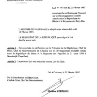 - Loi N° 97-008 du 21 février 1997 autorisant la ratification de l’accord sur le développement durable conclu entre la République du Bénin et le Royaume des Pays-Bas